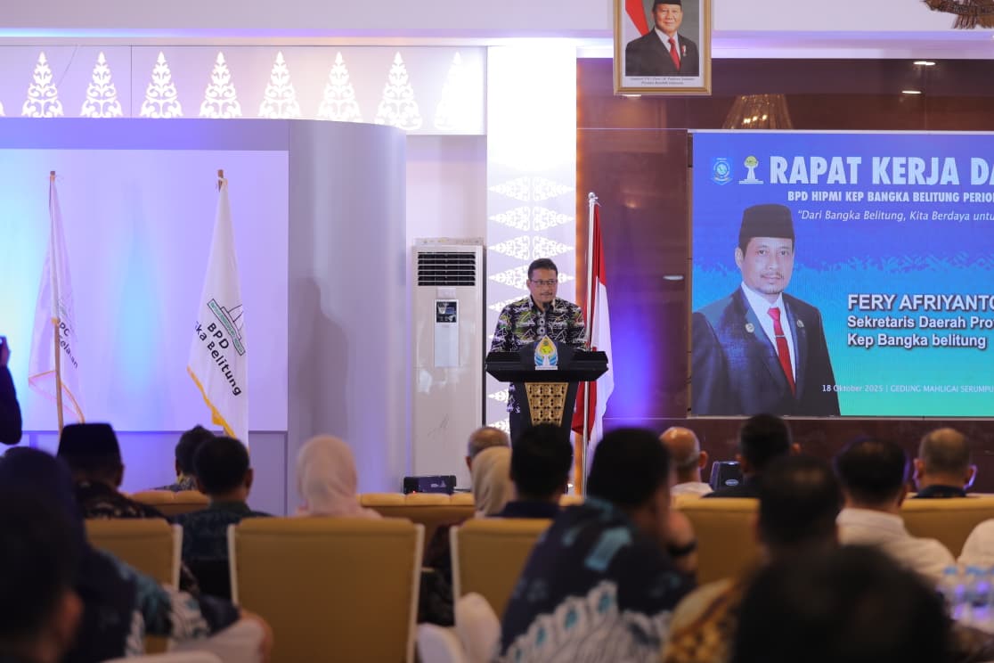 Gubernur Kepulauan Bangka Belitung (Babel), Hidayat Arsani melalui Pj Sekretaris Daerah (Sekda) Fery Afriyanto berkesempatan hadir sekaligus membuka Rapat Kerja Daerah (Rakerda) Badan Pengurus Daerah (BPD) Himpunan Pengusaha Muda Indonesia (HIPMI) Babel yang berlangsung pada Sabtu (18/10/2025) di Gedung Mahligai Rumah Dinas Gubernur.