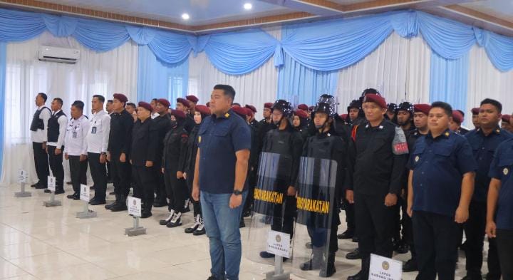Kepala Lembaga Pemasyarakatan (Lapas) Narkotika Kelas IIA Karang Intan, Yugo Indra Wicaksi, bersama jajaran petugas Regu Pengamanan (Rupam) menggunakan Perlengkapan Huru-Hara (PHH), mengikuti Apel Siaga Persiapan Pengamanan Perayaan Natal dan Tahun Baru (Nataru) Tahun 2025 yang digelar di Lapas Kelas IIB Banjarbaru, Rabu (24/12) pagi.