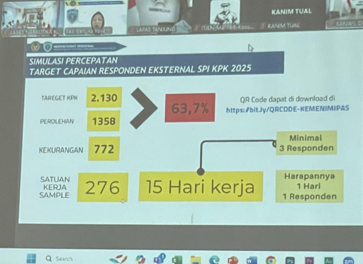 Lembaga Pemasyarakatan (Lapas) Narkotika Kelas IIA Karang Intan mengikuti kegiatan Zoom Monitoring Perolehan Responden Survei Penilaian Integritas (SPI) Tahun 2025 yang diselenggarakan oleh Inspektorat Jenderal Kementerian Imigrasi dan Pemasyarakatan Republik Indonesia (Kemenimipas), Senin (13/10).