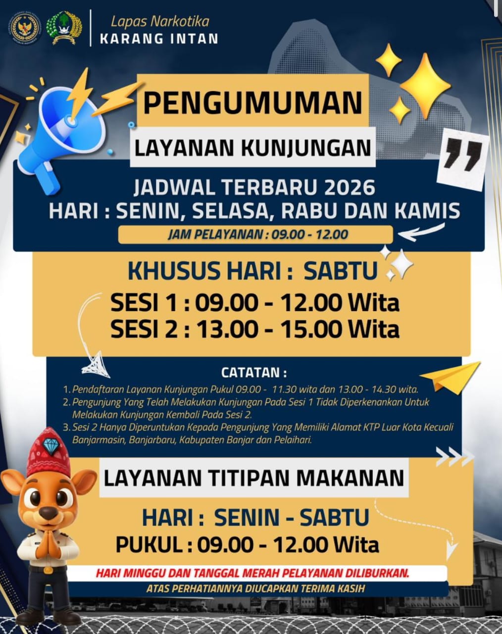 Selain layanan kunjungan, Lapas Narkotika Karang Intan juga tetap membuka layanan penitipan makanan bagi Warga Binaan pada hari Senin hingga Sabtu pukul 09.00–12.00 WITA. Sementara itu, seluruh layanan kunjungan dan penitipan makanan diliburkan pada hari Minggu dan tanggal merah.