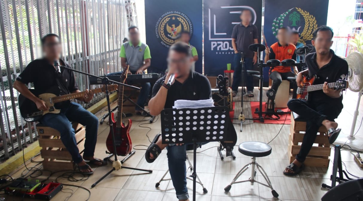 Iringan musik dari LP Project Band Lapas Kelas IIA Banjarmasin kembali menghidupkan suasana ruang kunjungan pada Kamis (6/11). Grup musik binaan warga binaan pemasyarakatan (WBP) ini tampil energik menghibur para tamu yang datang berkunjung ke lapas.